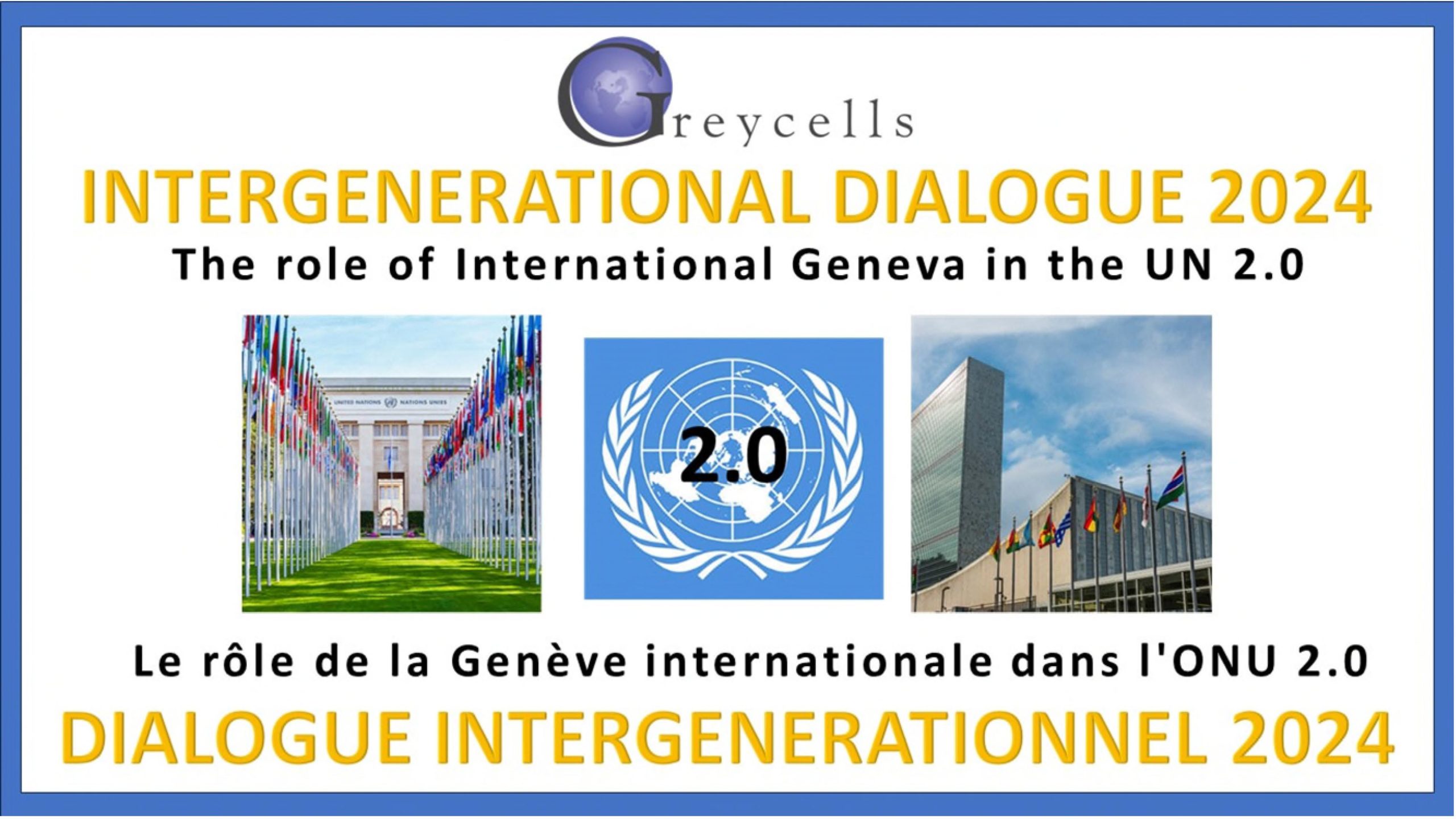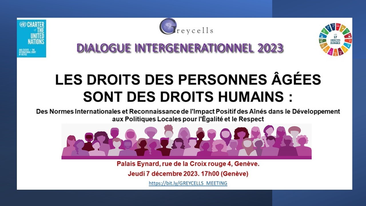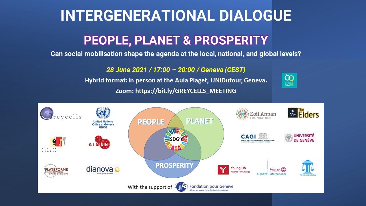 In 2018 the focus of Greycells was expanded to include intergenerational activities. Since then, all Greycells activities are a mix between seniors and millennials, between internationals and locals, and always respecting gender balance. The commemoration of the 10th Anniversary of Greycells at the Palais des Nations inaugurated our series of “Intergenerational dialogues”, which were preceded by a questionnaire distributed via Internet and social media in 60 countries. Since then, every year the intergenerational dialogues have taken place in collaboration with our traditional partners, as well as with the Geneva International Model United Nations (GIMUN), YouthUN, the Youth Parliament of Geneva, Rotary Geneva International, Cité Seniors of Geneva and the Platform of Associations of Seniors of Geneva.